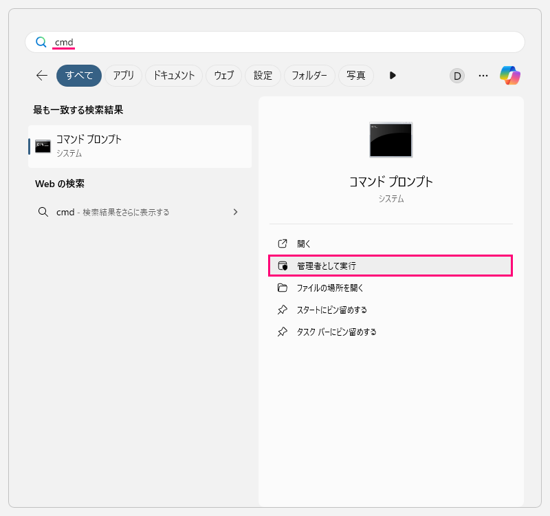 Windowsスタートからコマンドプロンプト(cmd)を入力し、[管理者として実行]をクリックします。