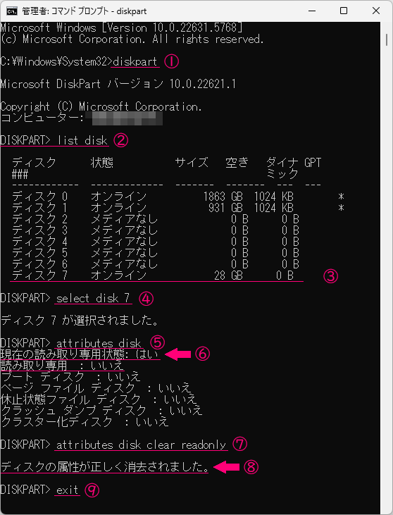 ⑦解除魔法[attributes␣disk␣clear␣readonly]を入力してEnter。