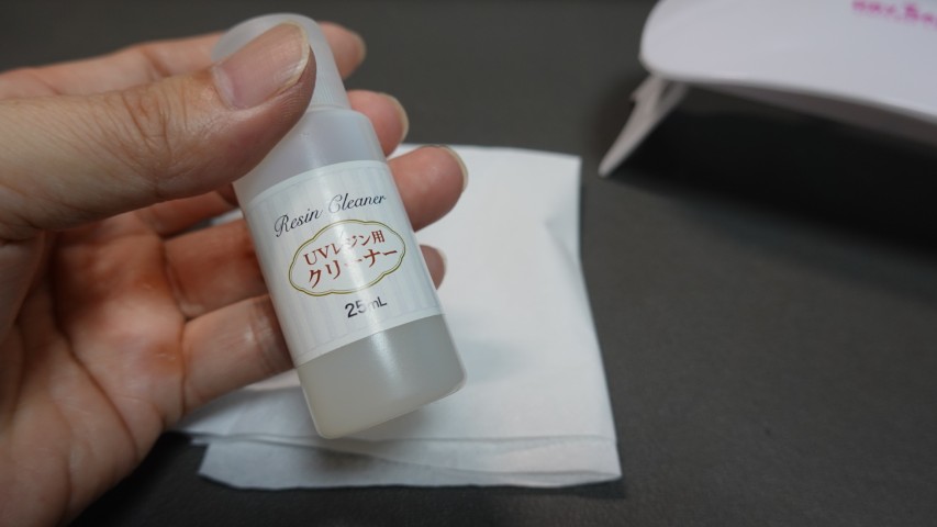 ライトを当ててレジンが固まった後も、表面にはネバネバとした未硬化成分が残ります。